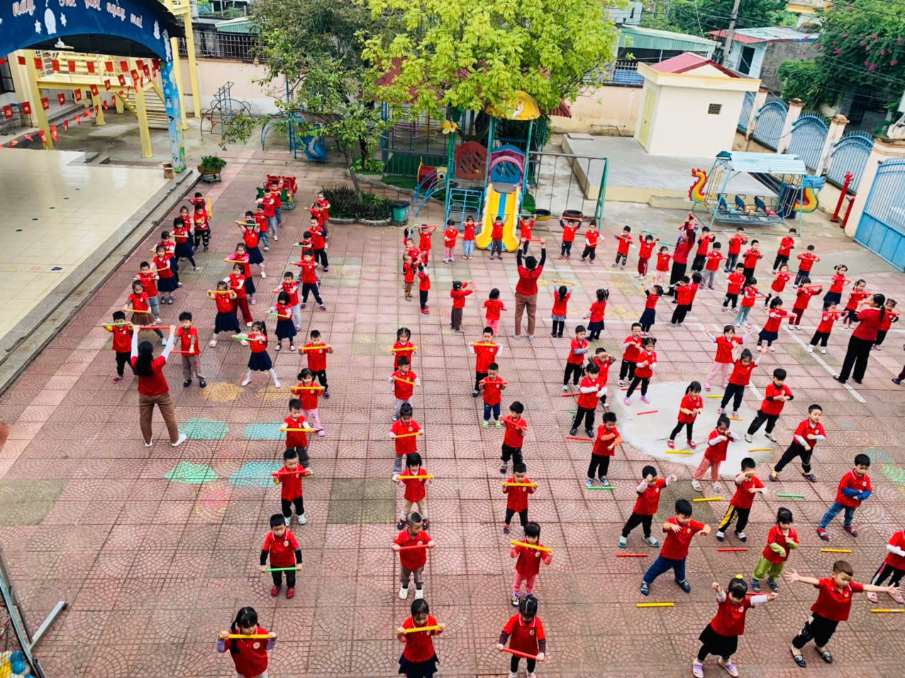 Các con thực hiện trong không khí vui tươi, rộn ràng, tiếng nhạc hòa cùng tiếng cười của trẻ tạo nên một bầu không khí sôi nổi, phấn khởi đầu ngày mới. Nhờ việc rèn luyện thường xuyên, trẻ ngày càng mạnh dạn, nhanh nhẹn, hình thành thói quen tốt trong việc rèn luyện sức khỏe và biết yêu thích các hoạt động vận động tập thể.