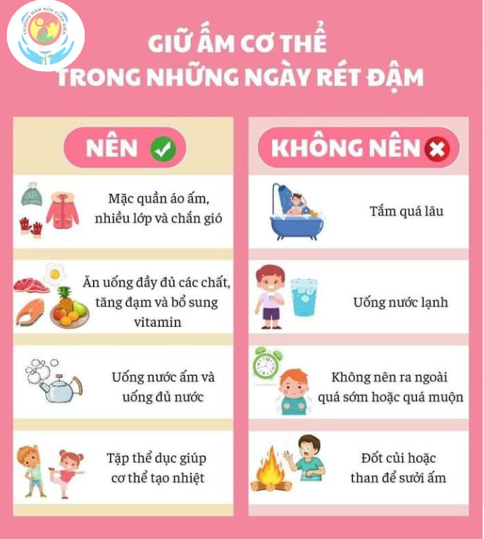 - Thường xuyên theo dõi dự báo thời tiết 6 giờ sáng hàng ngày để quyết định cho con đi học: Nếu nhiệt độ xuống dưới 10 độ C thì các bậc cha mẹ cho các cháu nghỉ ở nhà để đảm bảo sức khỏe cho trẻ. Nếu nhiệt độ mà trên 10 độ C thì bậc cha mẹ cho trẻ đi học bình thường và đảm bảo sức khỏe cho trẻ như: